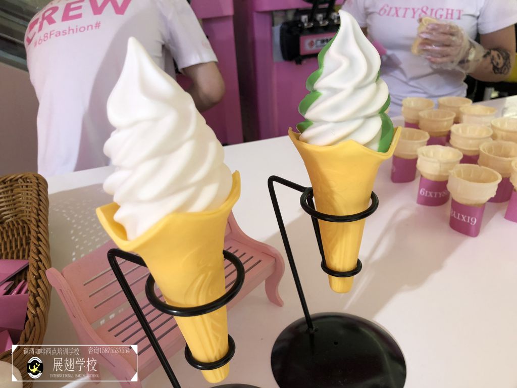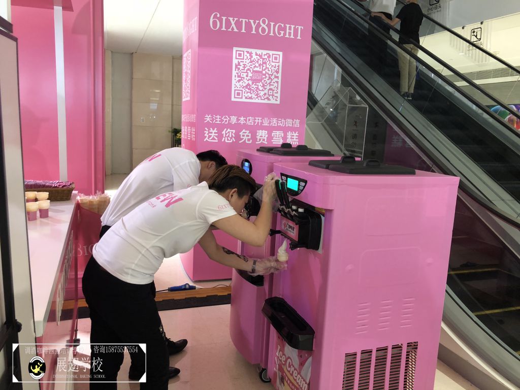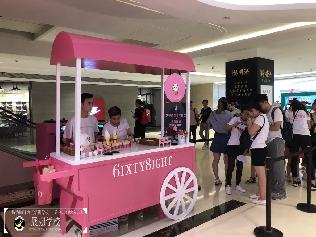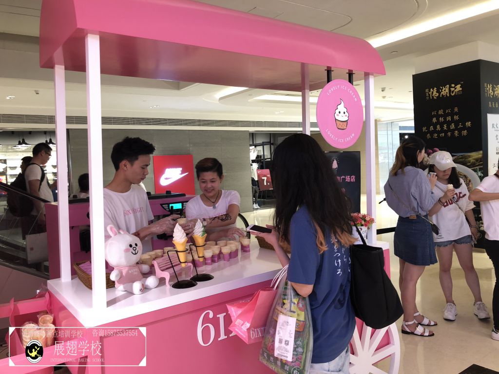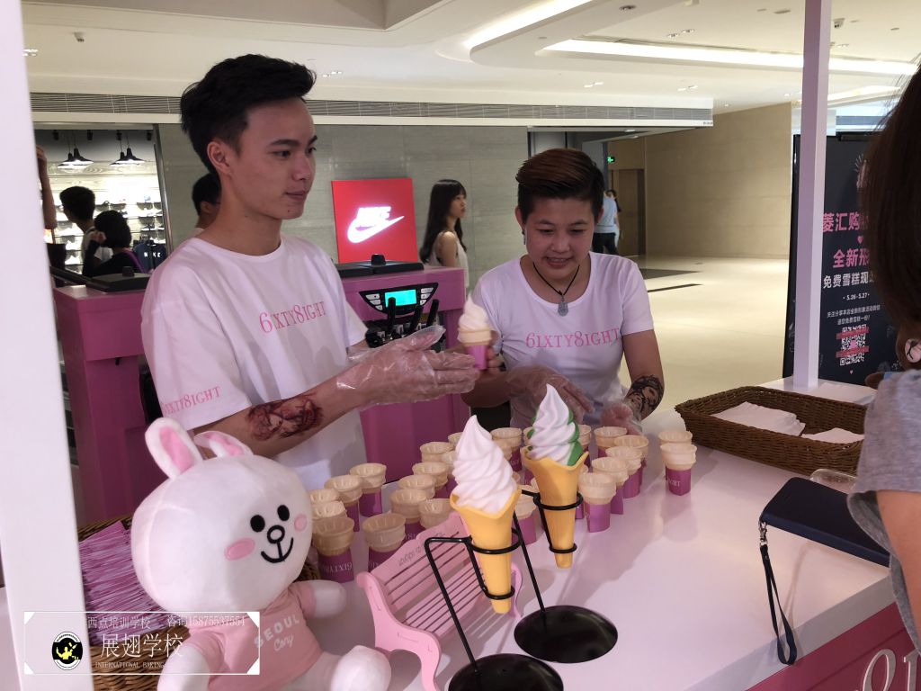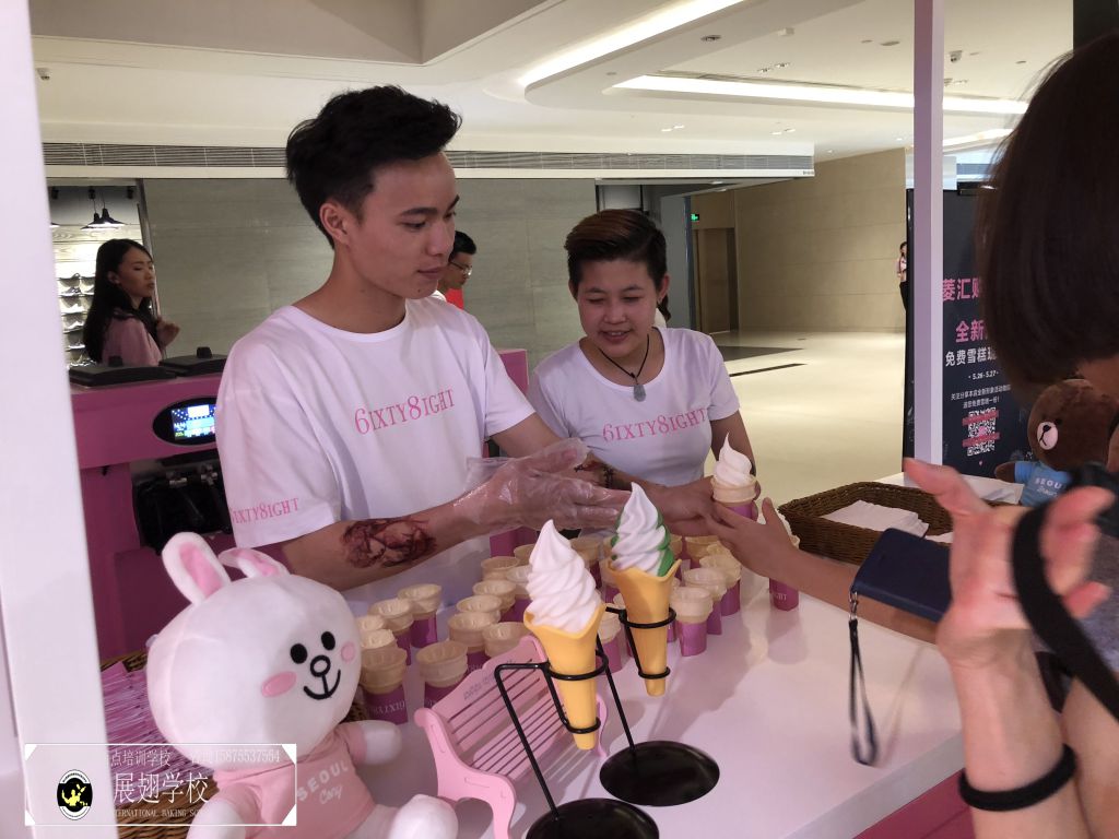 2018年5月26日,法國著名內衣品牌6ixty 8ight廣州分店正式開業。男女老少帶著愉快的心情來沾沾這熱鬧的氣息,并進店選購心儀的衣服。佛山展翅咖啡調酒西點培訓學校的蛋糕師學員們受邀為現場的開業活動向來來往往的顧客提供冰淇淋。在那樣美好的一天,有多少人在心底深深記住了我們學員的微笑和冰淇淋的甜美呢?