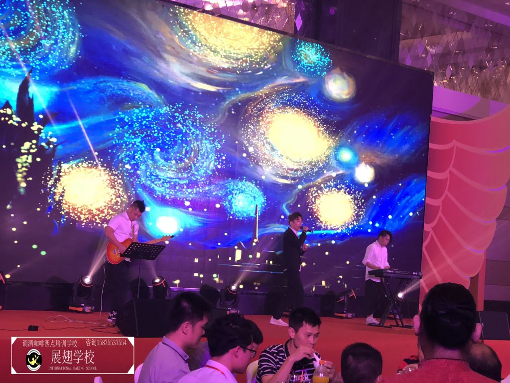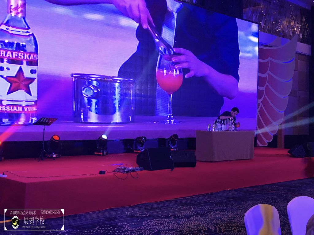 不多時(shí),全場佳肴已近杯盤狼藉,賓客們帶著點(diǎn)疲倦,會議氣氛一時(shí)走入低谷。瞬間,滾動性極強(qiáng)的音樂使得全場目光都投注到大屏幕上,佛山展翅咖啡調(diào)酒西點(diǎn)培訓(xùn)學(xué)校的花式調(diào)酒師張韋杰先生已經(jīng)登場。張韋杰先生前面的桌上擺放著七八瓶不同款式的酒,少許調(diào)酒工具,和一只雞尾酒酒杯。全場帶著好奇的目光盯著臺上:能調(diào)出什么顏色的酒?