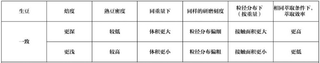 深烘的咖啡在相同的粒徑范圍(意味著基本相同的接觸面積)下,萃取效率有可能比淺烘更慢的。但這一特點(diǎn)無法中和體積帶來的萃取加速,再加上“深烘豆在研磨時(shí)更傾向于精細(xì)分布”,都支撐著“熟豆密度越低越容易萃取”這個(gè)說法。