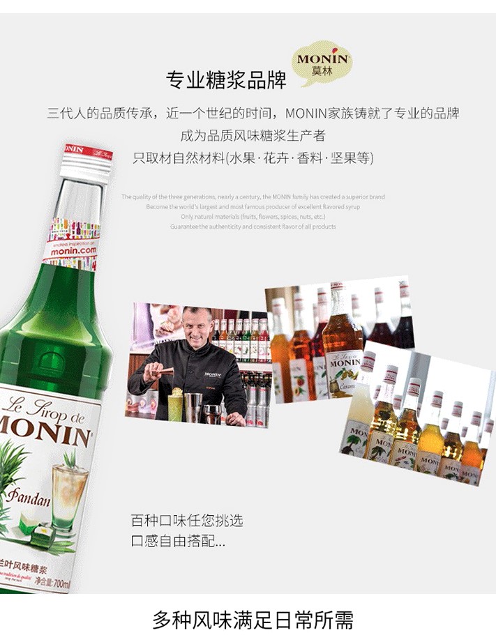 1912 年,Georges MONIN在法國創(chuàng)立了以家族名字命名的品牌與第一家工廠,專注生產優(yōu)質利口酒與糖漿。因他對待品質的熱誠與執(zhí)著讓產品脫穎而出,讓MONIN成為優(yōu)質產品的代名詞,現(xiàn)已是世界上著名的風味糖漿生產者。近年來,MONIN堅持不斷創(chuàng)新,嚴打新風味與應用方式,致力于傳遞完美餐飲體驗,引領飲品多元化發(fā)展,為餐飲企業(yè)提供完美解決方案!