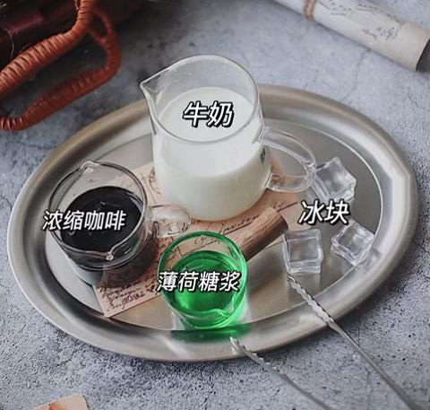 濃縮咖啡40ml/牛奶180ml/薄荷糖漿20ml/碎冰
