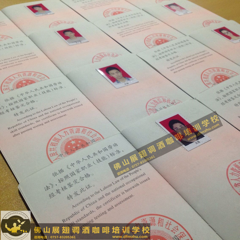 以下所有證書,都是佛山展翅調酒咖啡西點培訓學校畢業學生,考取的調酒師、咖啡師、西點師職業資格證書,為了防止盜圖,全部加了水印。
