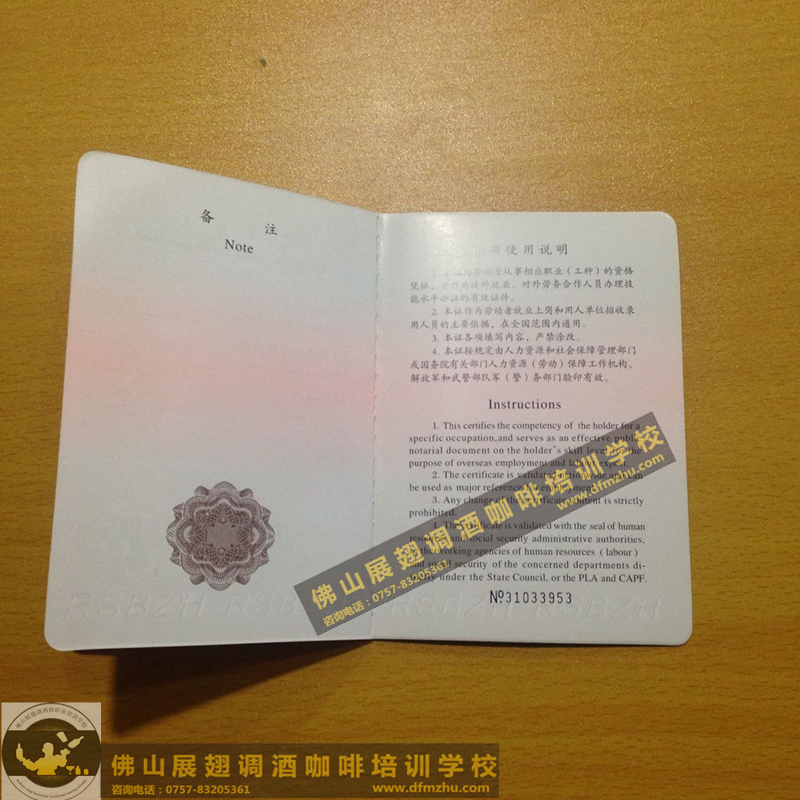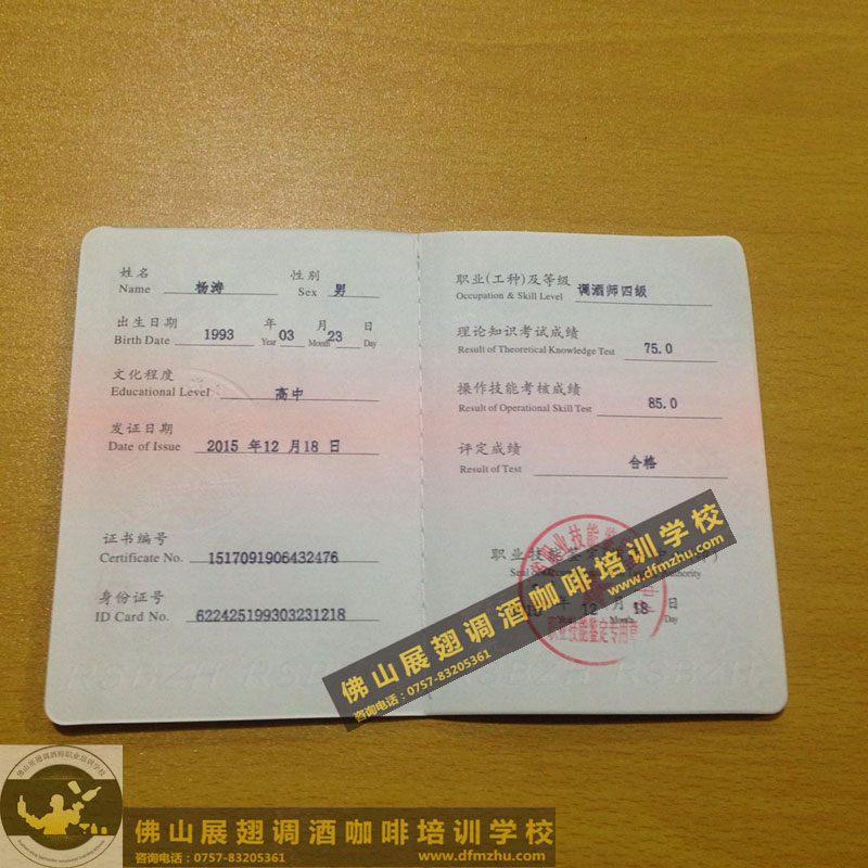 中英文版的職業資格證書出國通用。(調酒師、咖啡師、西點師職業資格證書)佛山展翅調酒咖啡西點培訓學校畢業學生,100%通過率,順利拿到中華人民共和國人力資源和社會保障部,頒發的調酒師、咖啡師、西點師職業資格證書部分樣版。